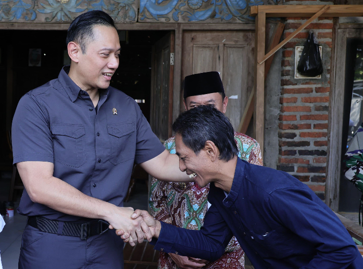 Menteri AHY menyapa dan berdialog dengan masyarakat sembari menyerahkan sertipikat tanahnya secara door to door untuk memastikan program Pendaftaran Tanah Sistematis Lengkap (PTSL) berjalan baik dan mengimbau masyarakat agar menjaga sertipikat tanahnya.